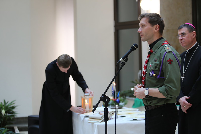 Płomień pochodzący z groty Narodzenia Chrystusa w Betlejem na ręce Sekretarza Generalnego Episkopatu przekazał naczelny kapelan ZHP ks. hm. Tomasz Kozłowski wraz z harcerzami. „To światło symbolizuje Jezusa Chrystusa, Tego, który przynosi pokój i Tego, który ma oświecić ciemności i Tego, który wprowadza w nasze życie miłość” – powiedział. Odnosząc się do tegorocznego hasła akcji, ks. Kozłowski zaznaczył, że „jest to zadanie wszystkich nas, chrześcijan, uczniów Chrystusa, którzy chcą być misjonarzami, żeby pielęgnować dobro w sobie i zauważać je w innych”.