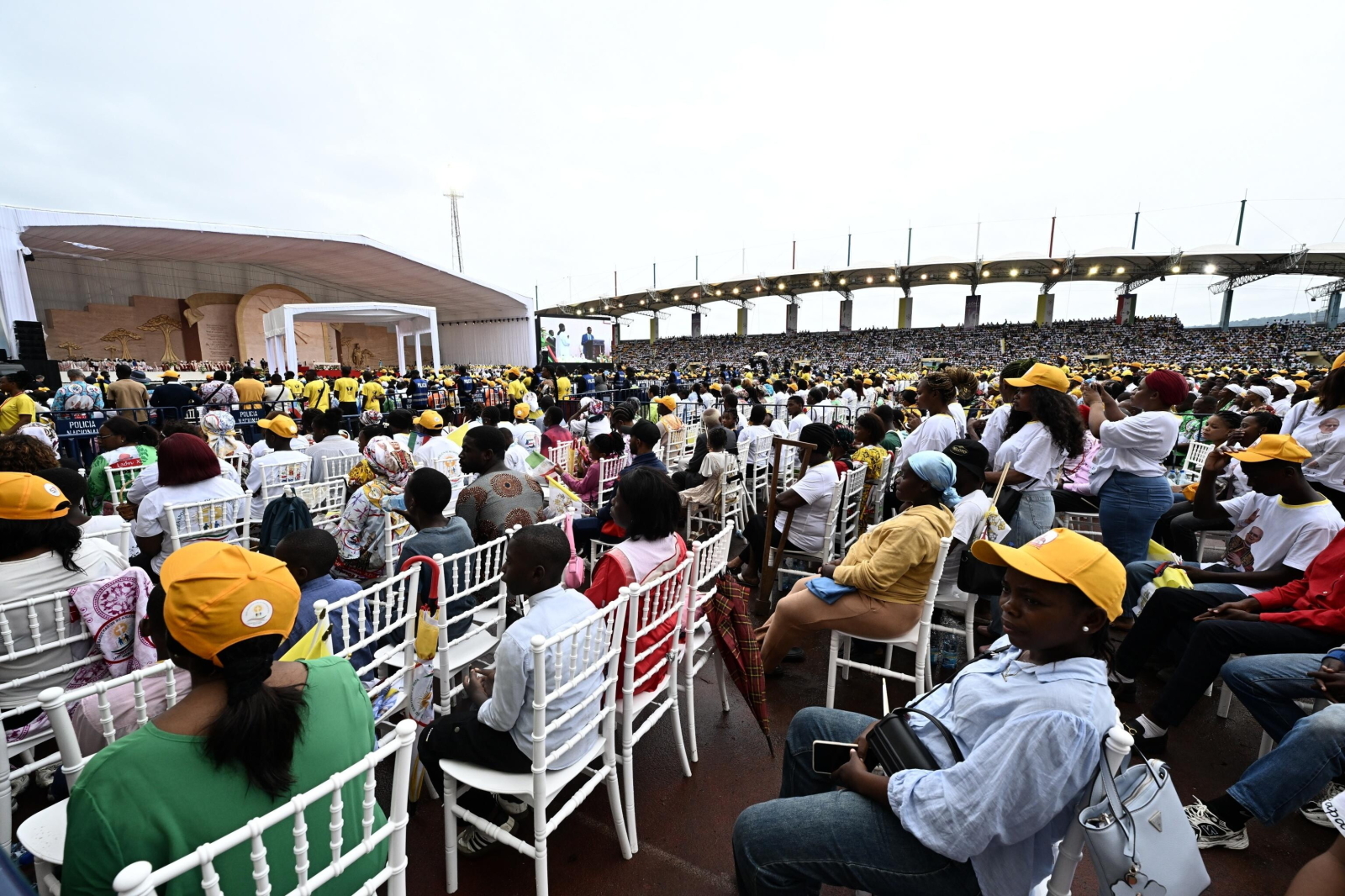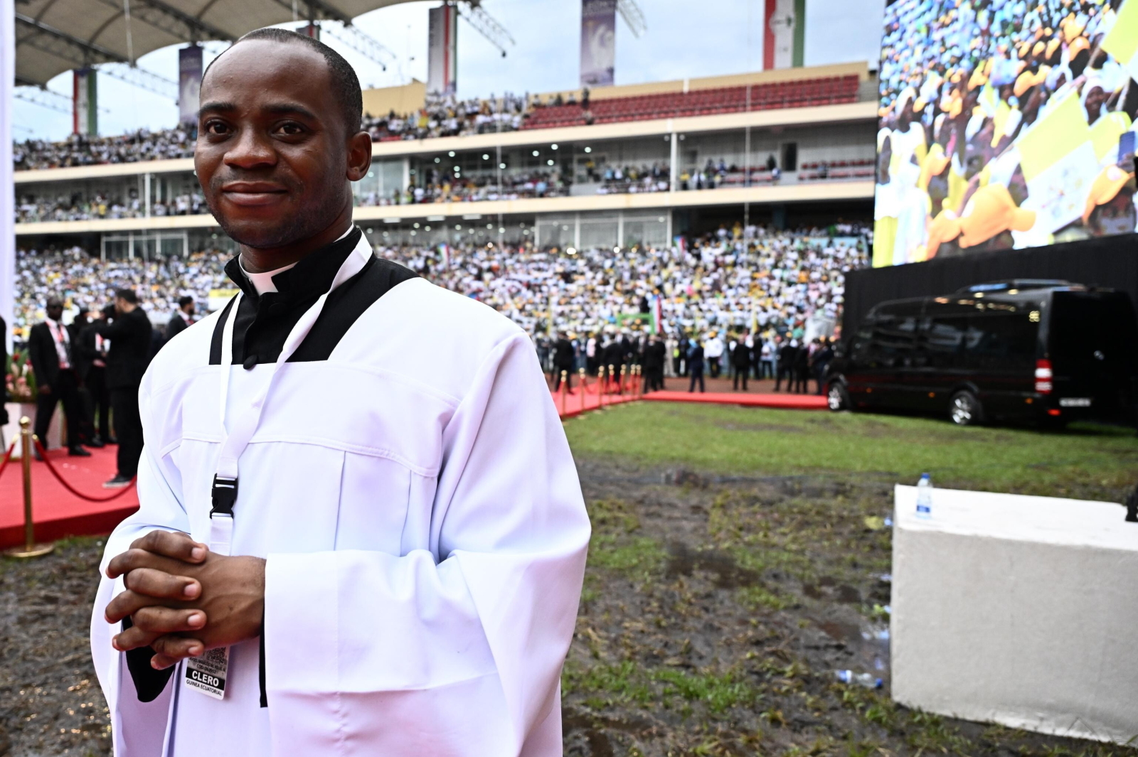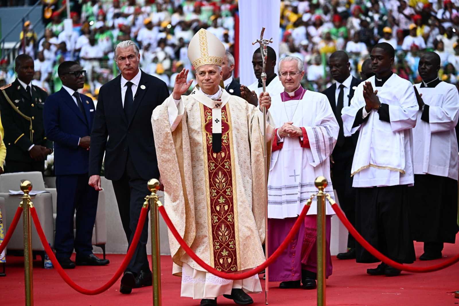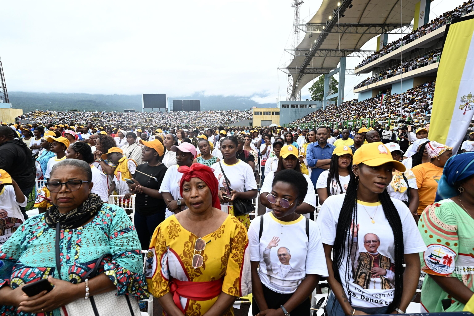 epa12908854 Pope Leo XIV (C) arrives to lead the Holy Mass in the Malabo Stadium in Malabo, Equatorial Guinea, 23 April 2026. Pope Leo XIV is on an apostolic journey to Equatorial Guinea. EPA/LUCA ZENNARO Dostawca: PAP/EPA.