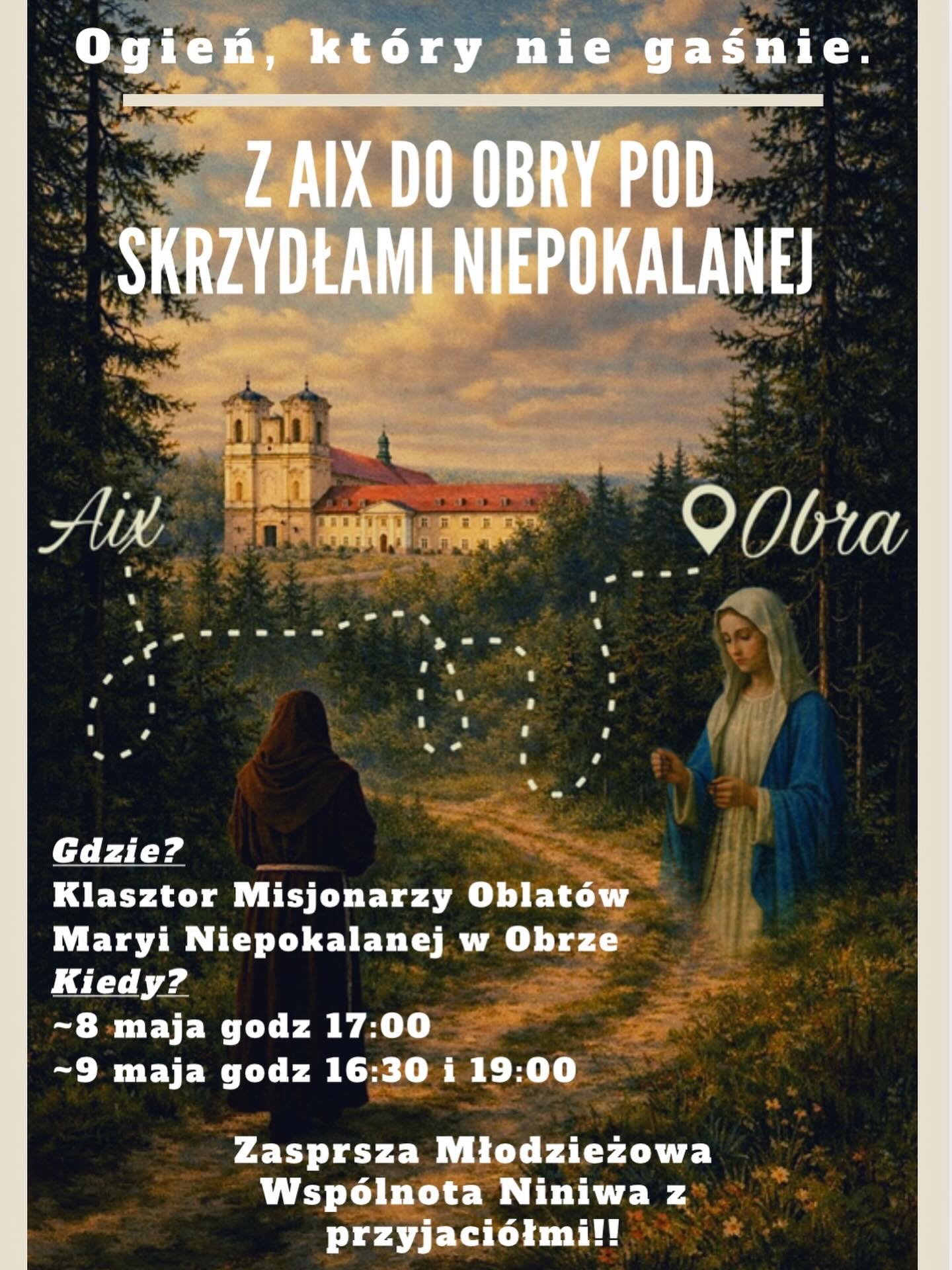 Młodzieżowa Wspólnota NINIWA działająca w Obrze wraz z Wyższym Seminarium Duchownym Misjonarzy Oblatów zapraszają na sztukę teatralną pt. „Ogień, który nie gaśnie – z Aix do Obry pod skrzydłami Niepokalanej”. Premiera już 8 maja.