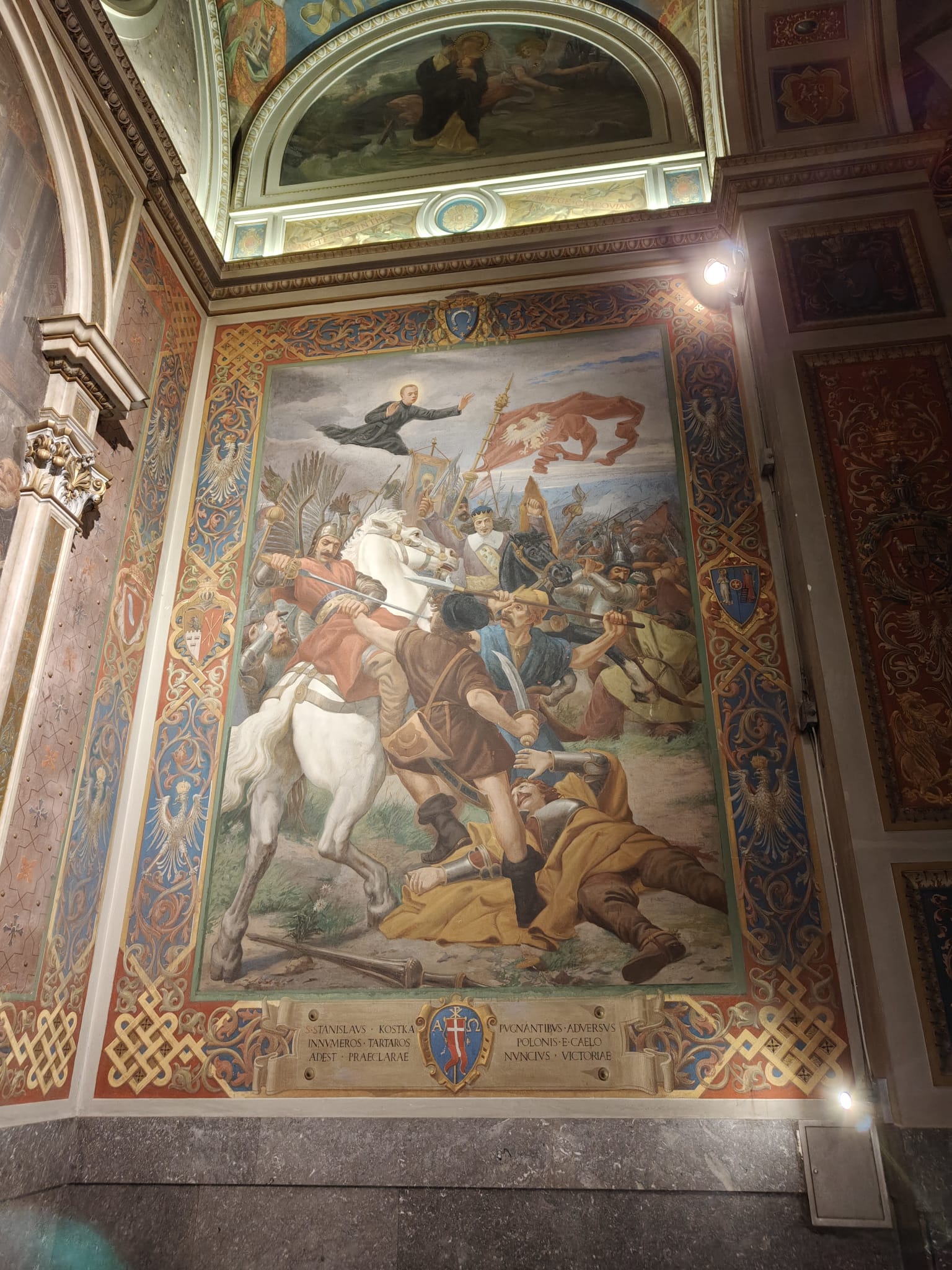 W kaplicy dominuje biały marmur i złocone zdobienia, a całość dopełniają bogate freski. Wśród nich warto wymienić przedstawienia św. Kazimierza z kartuszem „Omni die dic Mariae” („Każdego dnia pozdrawiaj Maryję”) czy sceny z życia św. Stanisława Kostki – m.in. jego mistyczne przyjęcie Komunii z rąk anioła oraz wspieranie Polaków w bitwie przeciwko Tatarom.
